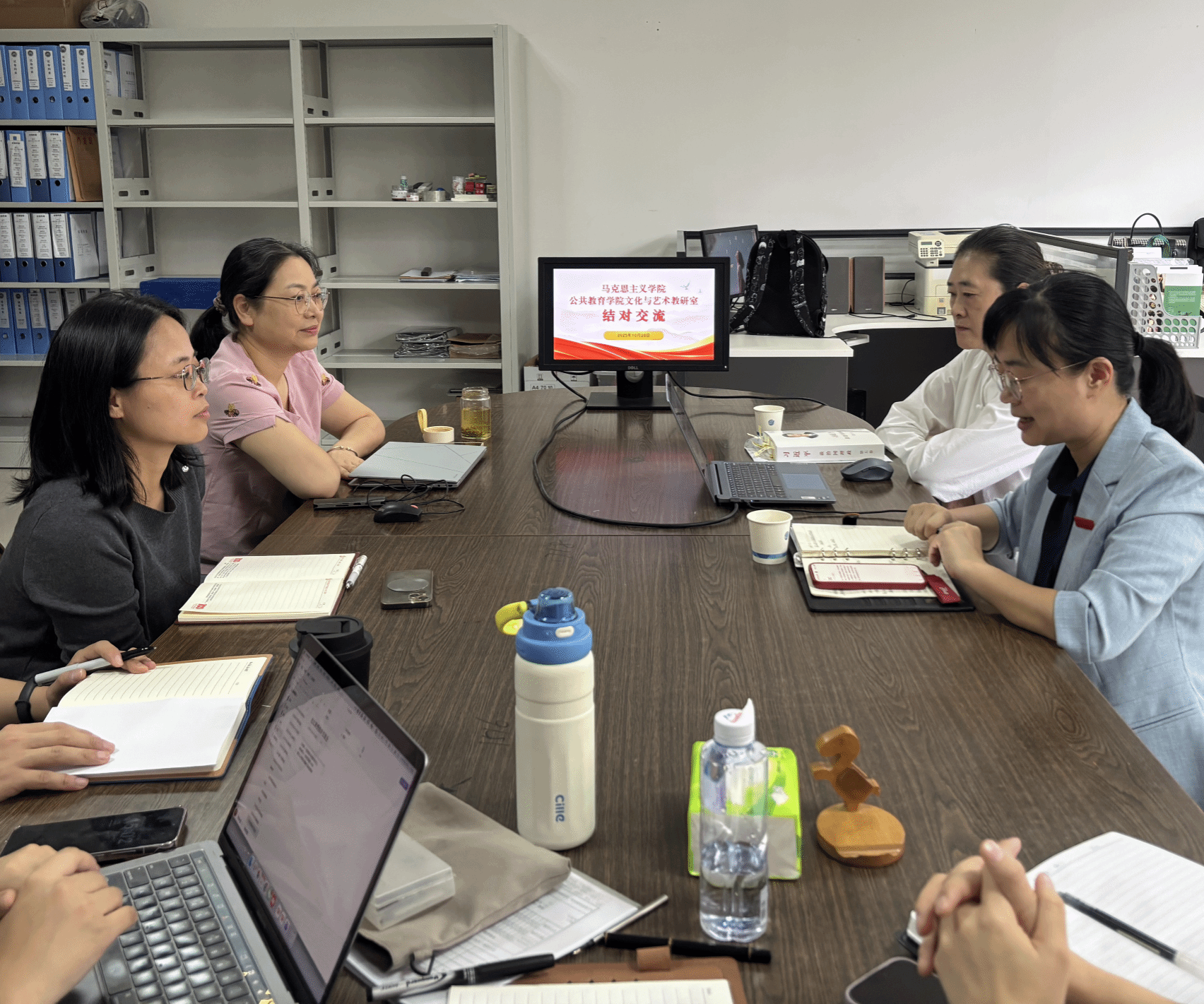 为深入贯彻落实立德树人根本任务,扎实推进课程思政建设,促进思政教育与专业教育的深度融合,近日,马克思主义学院沈红教授应邀与文化艺术教研室举行结对交流会。公共教育学院副院长张娴静,文化艺术教研室全体老师参加交流会。
