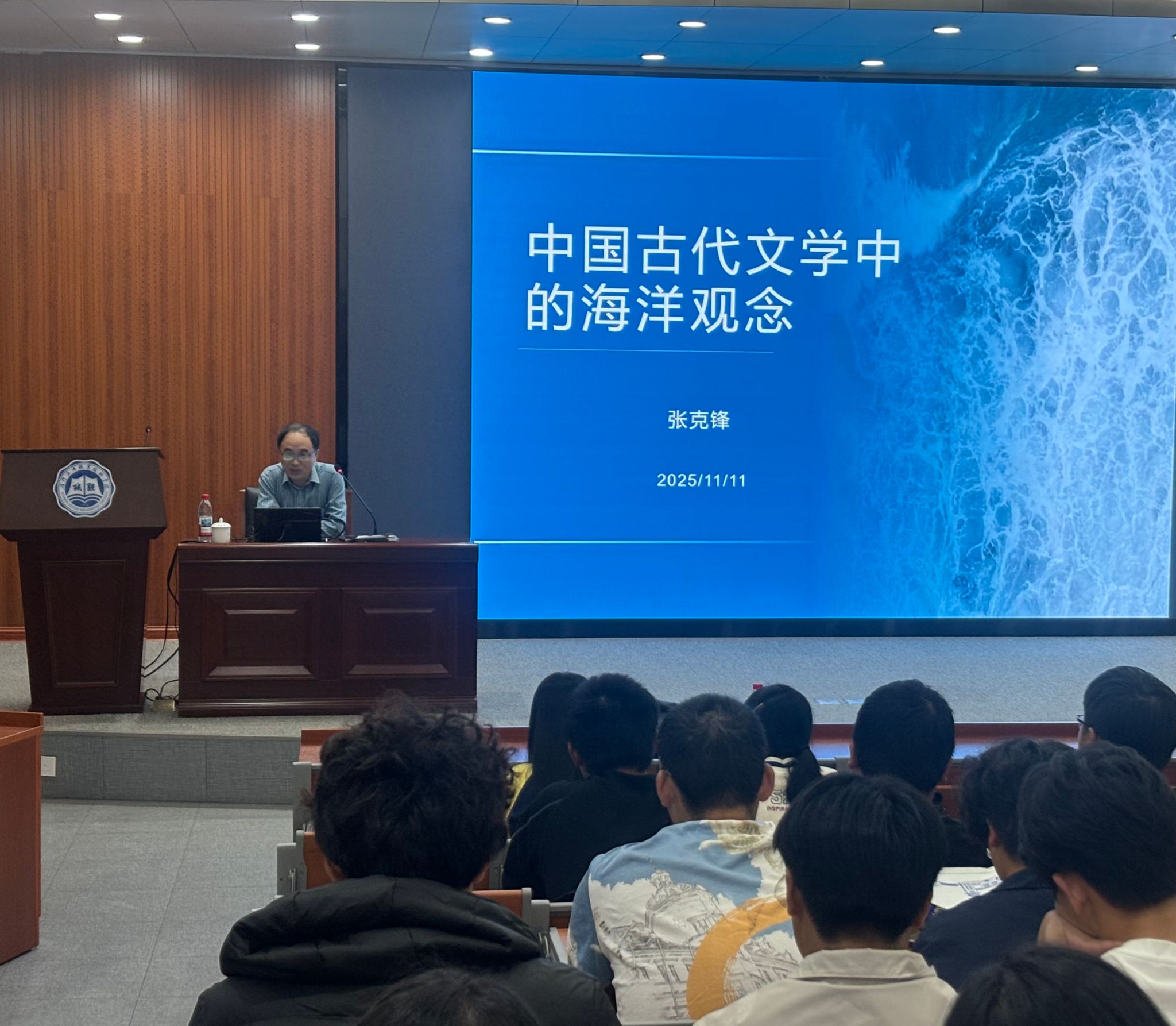 讲座中,张克锋教授以深厚的文学功底和广阔的文化视野,系统梳理了中国古代文学作品中有关海洋的思想观念与文化意象,探讨了“海洋”在文学叙事、精神象征以及文化心理中的多重意义。他结合典型文学文本,从《山海经》《诗经》到唐宋诗词,生动展示了古人对海洋的想象与认知,引发了现场师生的浓厚兴趣与深入思考。