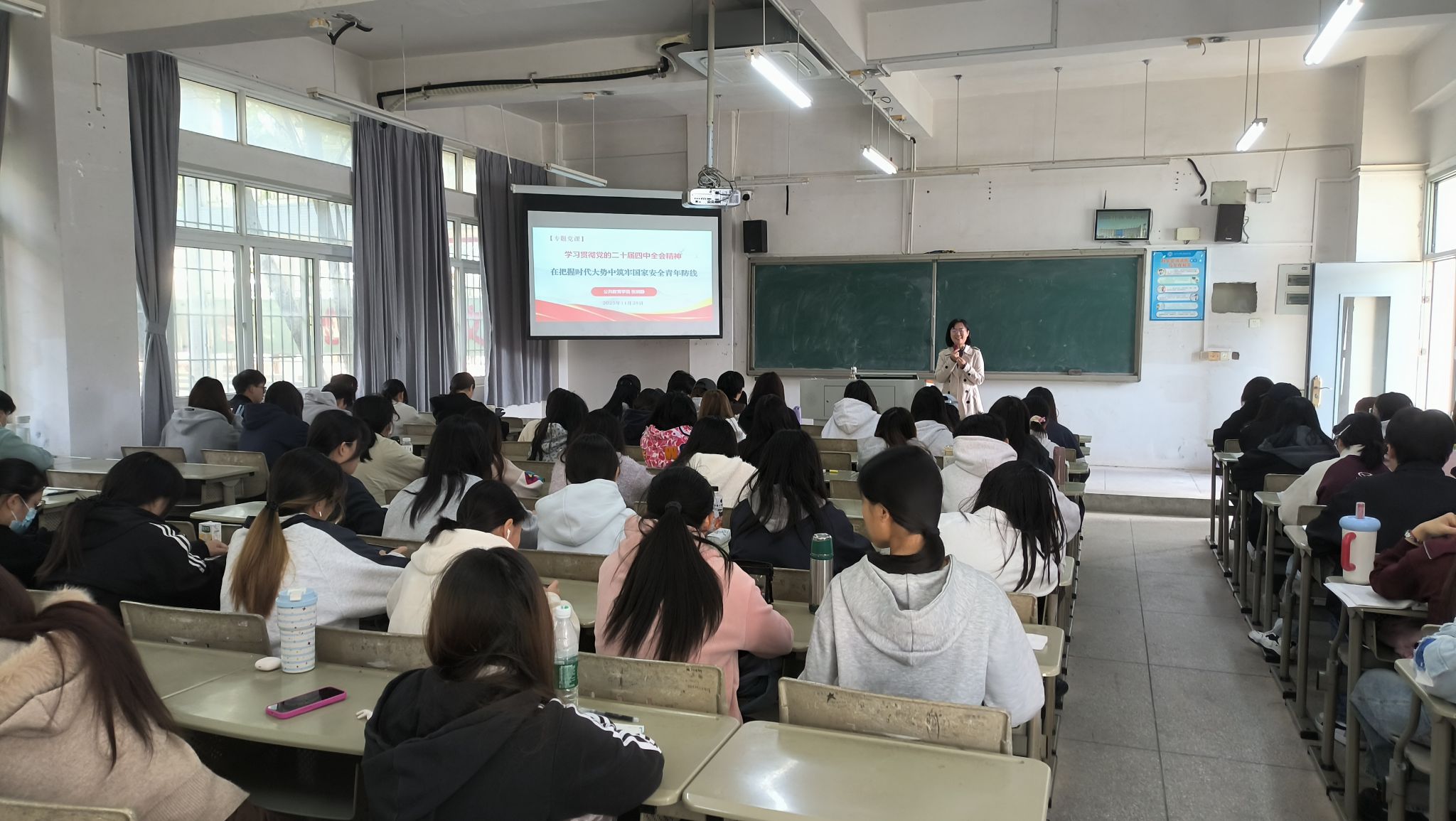 2025年11月28日,公共教育学院党总支副书记、副院长张娴静为食药3251班与跨境3254班的学生,开展以《学习贯彻党的二十届四中全会精神一在把握时代大势中筑牢国家安全青年防线》为主题的党课及宣讲活动。