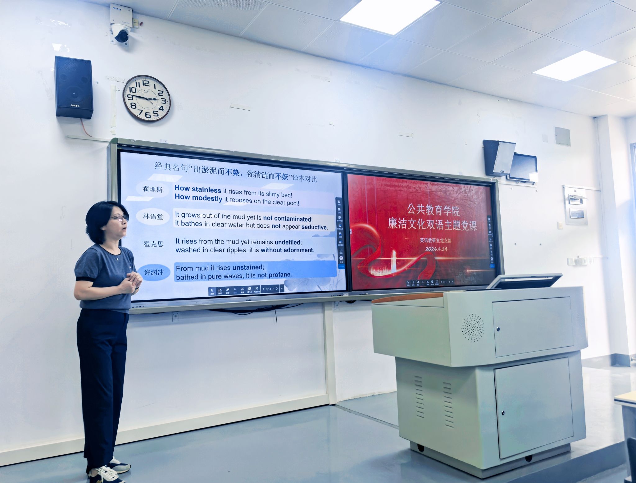 英语教研室党员教师封虹虹围绕《爱莲说》经典名句开展英译赏析,对比翟理斯、林语堂、许渊冲等名家译本,讲解东方廉洁意象的跨文化表达技巧,帮助同学们用英语精准传递“莲即君子、廉以修身”的价值理念,拓宽廉洁教育的国际视野。