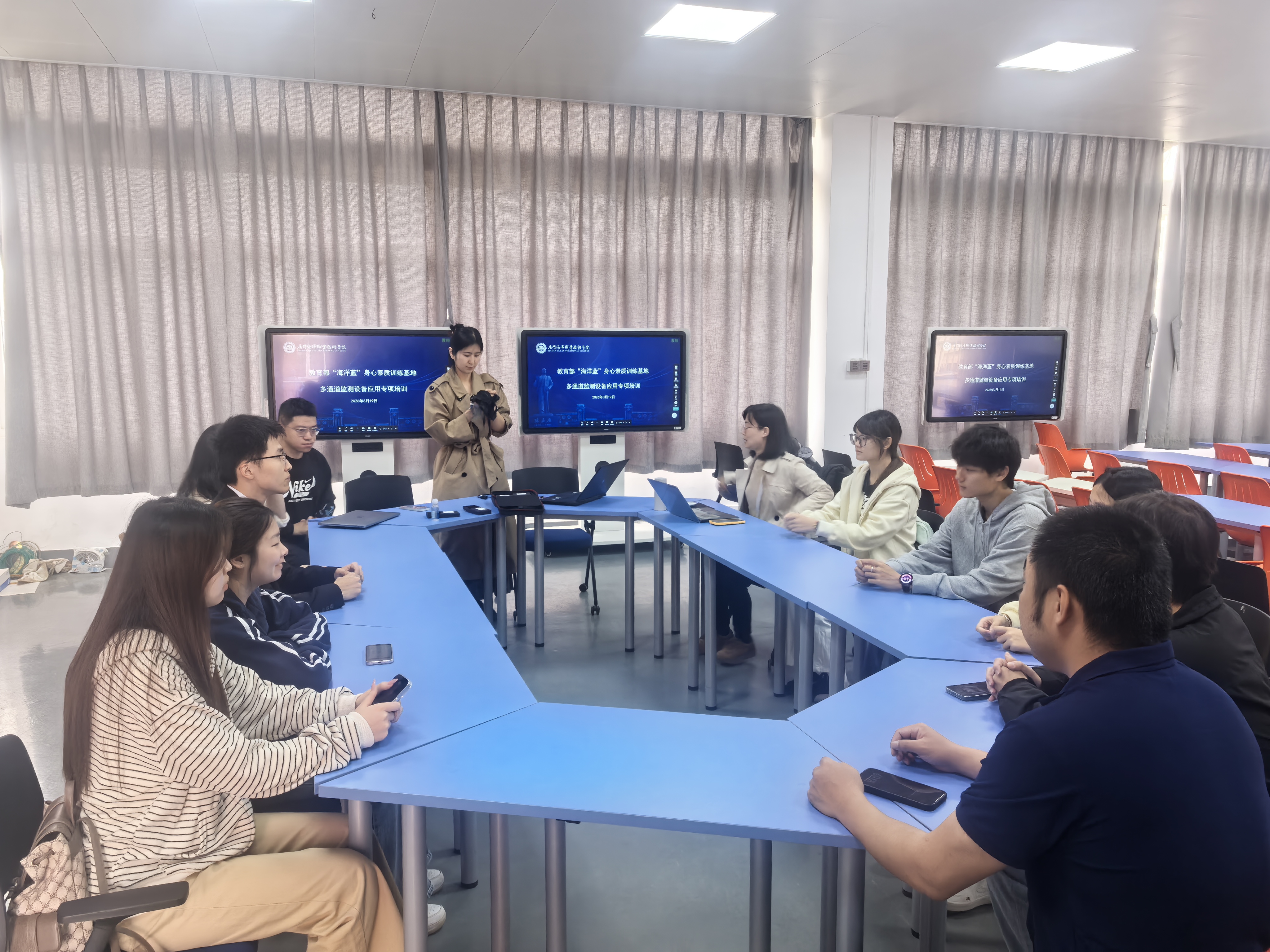 为充分发挥科技赋能学生身心素质训练成效,2026年3月19日,我校立项建设的教育部“海洋蓝”身心素质训练基地开展多通道监测设备应用专项培训。上海形宙信息技术有限公司技术人员担任主讲,“海洋蓝”基地建设团队成员全程参训。