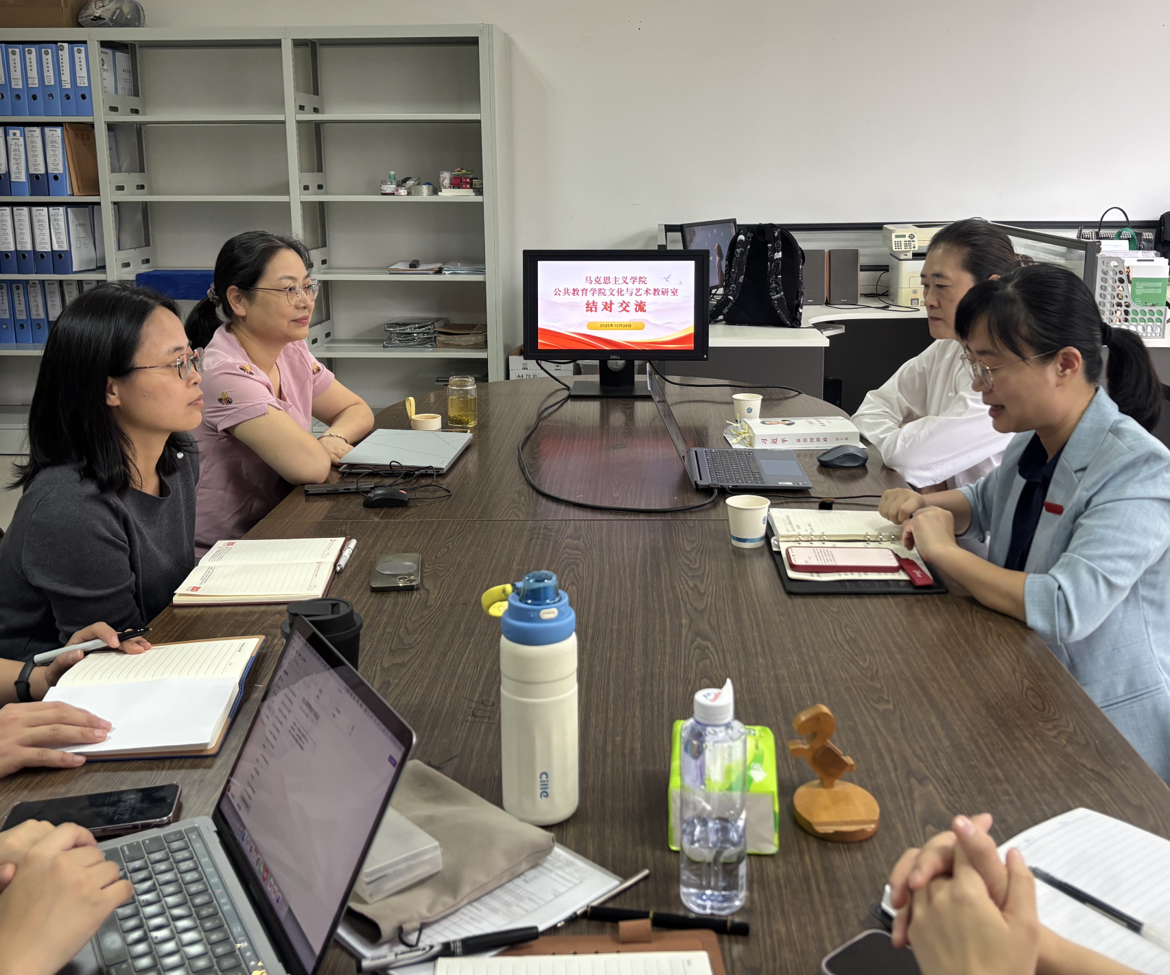 为深入贯彻落实立德树人根本任务,扎实推进课程思政建设,促进思政教育与专业教育的深度融合,近日,马克思主义学院沈红教授应邀与文化艺术教研室举行结对交流会。公共教育学院副院长张娴静,文化艺术教研室全体老师参加交流会。