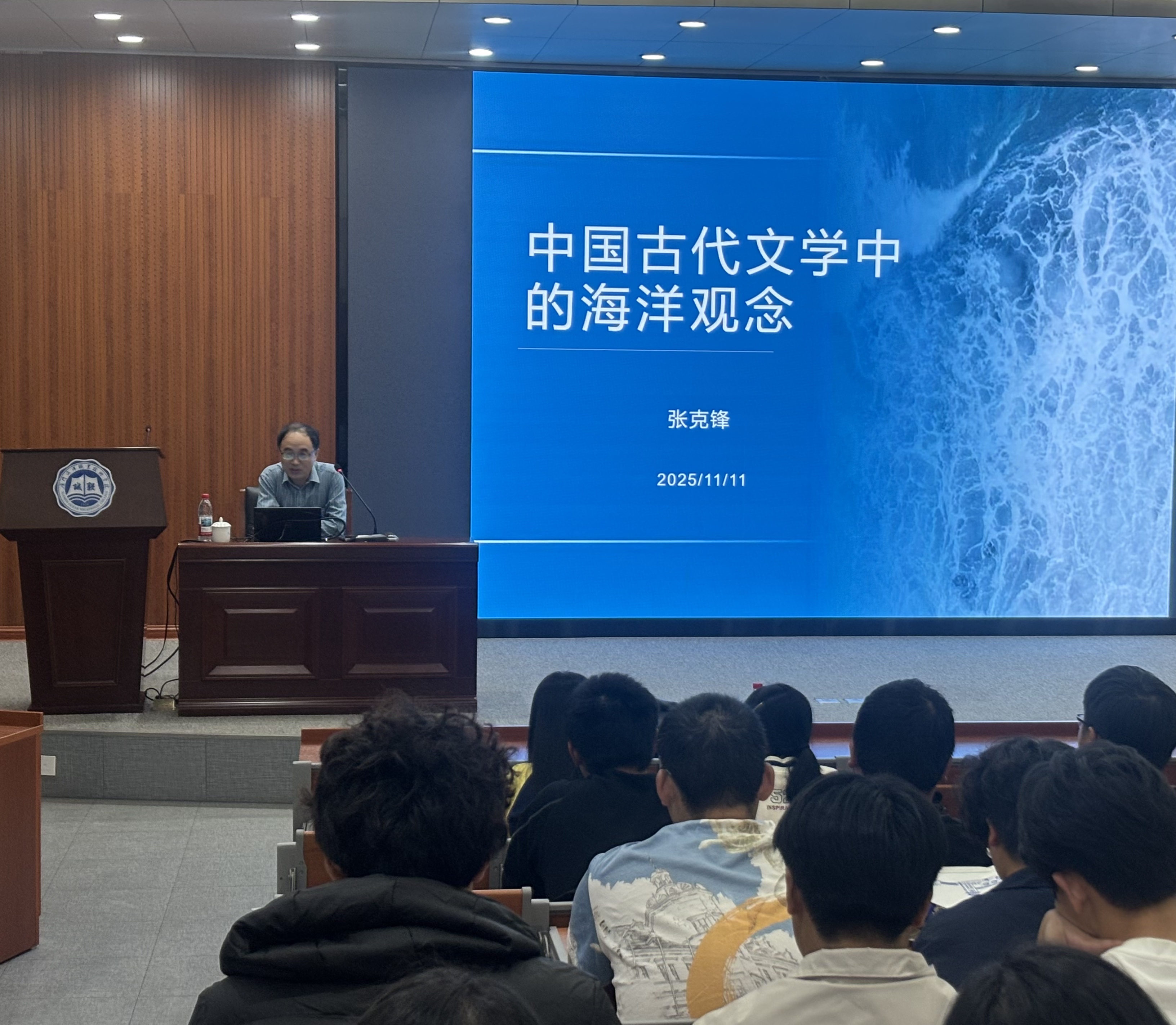 讲座中,张克锋教授以深厚的文学功底和广阔的文化视野,系统梳理了中国古代文学作品中有关海洋的思想观念与文化意象,探讨了“海洋”在文学叙事、精神象征以及文化心理中的多重意义。他结合典型文学文本,从《山海经》《诗经》到唐宋诗词,生动展示了古人对海洋的想象与认知,引发了现场师生的浓厚兴趣与深入思考。