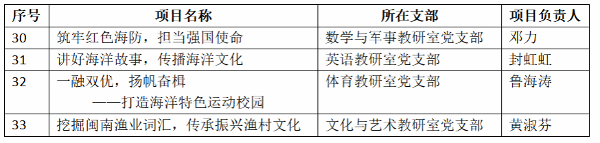 近日,中共厦门海洋职业技术学院委员会公布了2024-2026学年党支部工作“立项活动”校级立项项目名单。公共教育学院各党支部深入学习贯彻习近平总书记关于党的建设的 重要思想,聚焦增强党组织政治功能和组织功能,围绕学校中心工作、党建重点任务要求、党建工作薄弱环节和重难点问题,认真筹备、精心设计、积极申报,经评选研究,我院推荐申报的4个项目获立项。