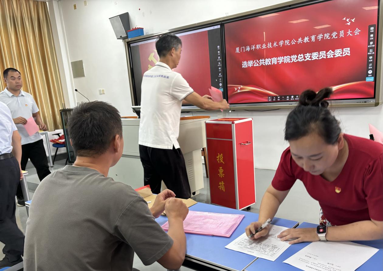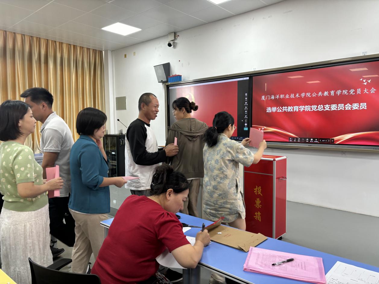 在工作人员的监督下,各位党员依次往投票箱中进行投票。经监票人、计票人统计得票情况,叶小超、张娴静、葛冯敏、刘娟、鲁海涛五名同志当选厦门海洋职业技术学院公共教育学院总支部委员会委员。