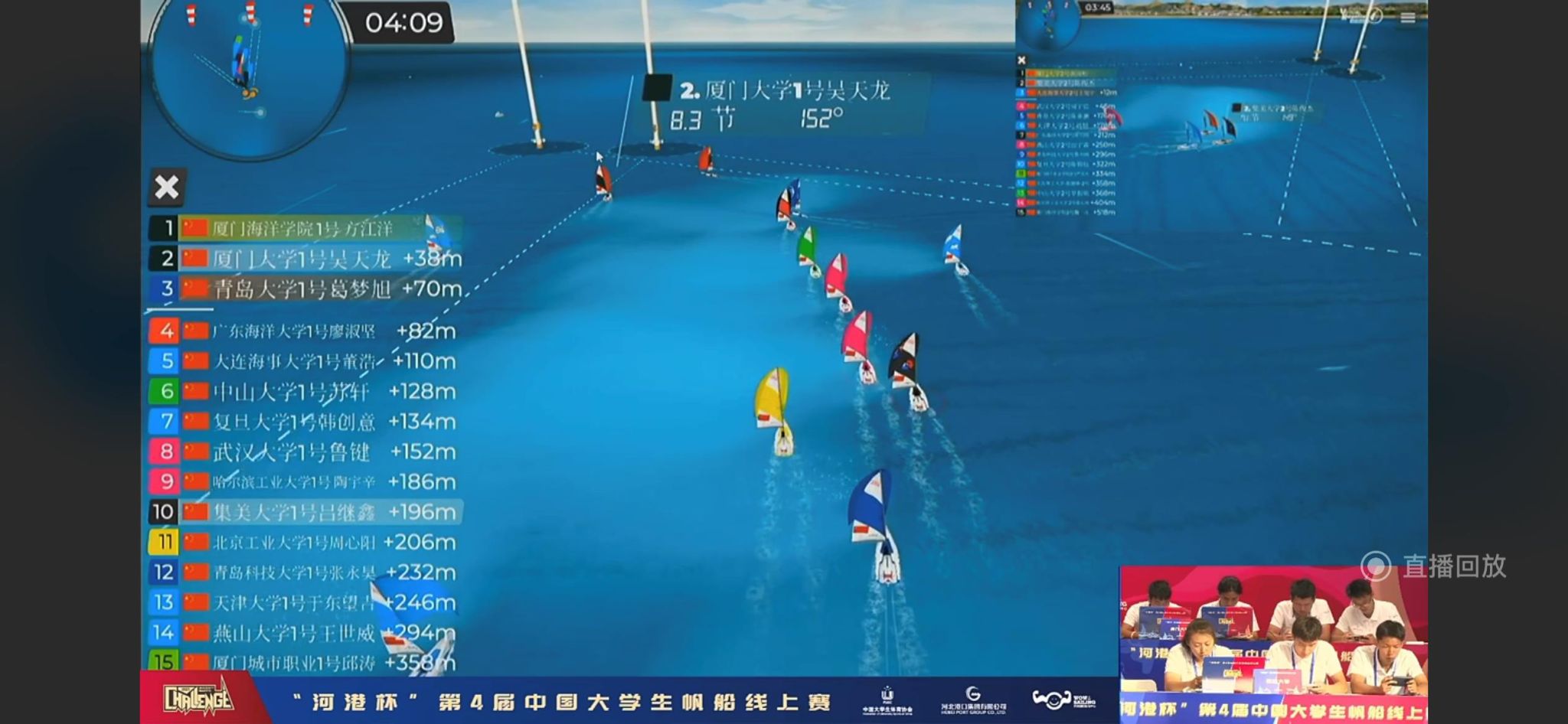 中国大学生帆船线上赛自2020年开始已成功举办四届,比赛采用 Virtual Regatta - VR INSHORE APP 以虚拟赛事的形式进行帆船Fareast 28级别比赛。比赛真实还原了帆船比赛的现实场景,在遵守世界帆联相关竞赛规则的基础上做了一些虚拟竞赛上的创新。各支参赛队伍不出国门就能在悉尼、考兹、里约、基尔、旧金山等世界知名赛场与各高校选手进行帆船线上比赛。