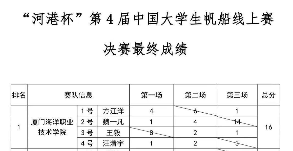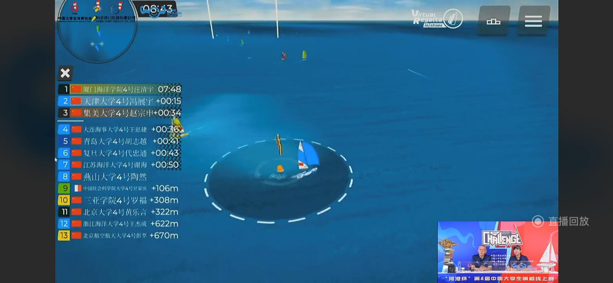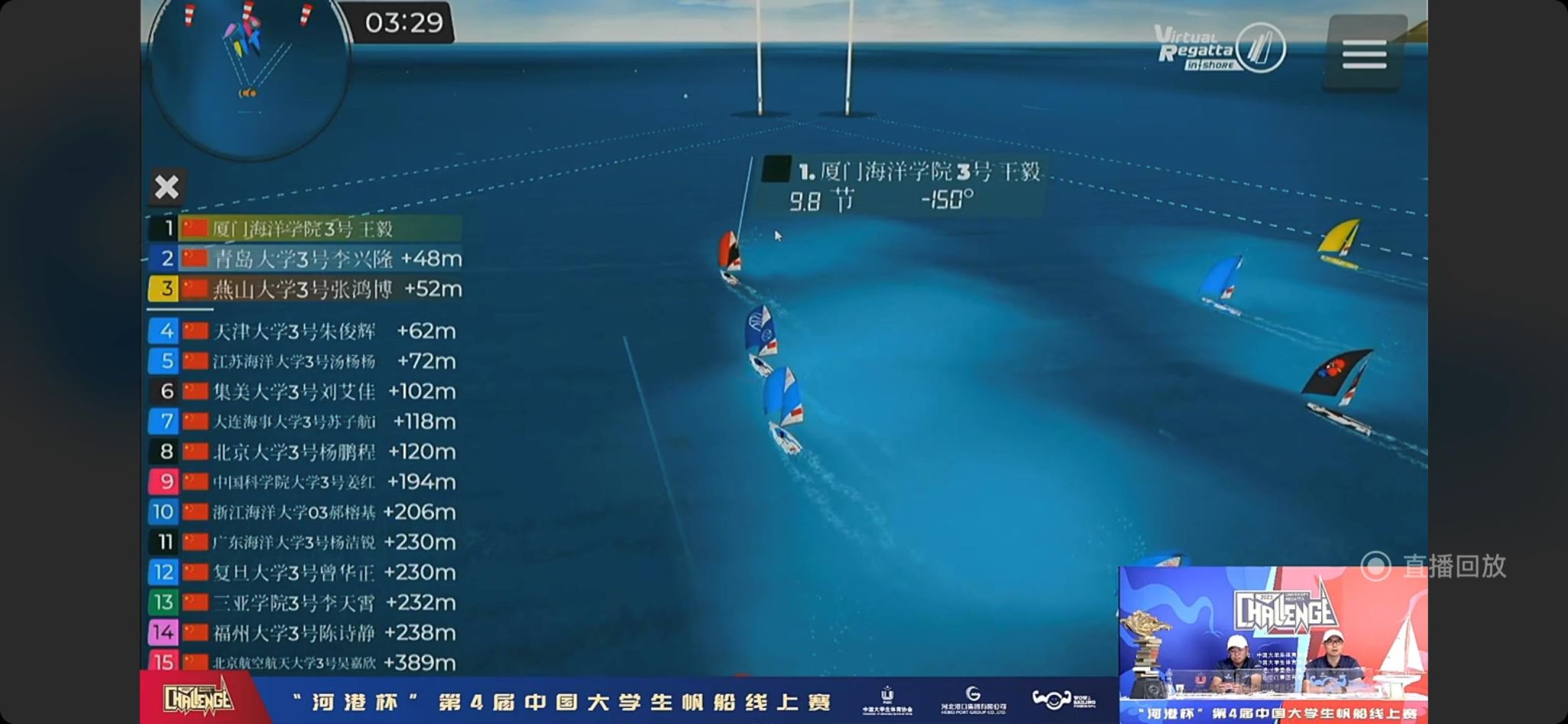 2023年中国大学生帆船线上赛于8月21日至24日在VR INSHORE APP举行,来自清华大学、北京大学、厦门大学、武汉大学、中国海洋大学、大连海事大学等全国33支高校代表队进行角逐,经过三天60轮的竞赛,我校帆船队蝉联冠军,实现三连冠。