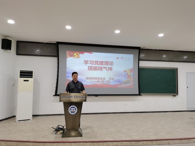 6月16日下午,按照“深化大学习提振精气神”专项活动方案,基础部党总支副书记王斌为全体党员上了一堂《学习党建理论提振精气神》的专题党课。