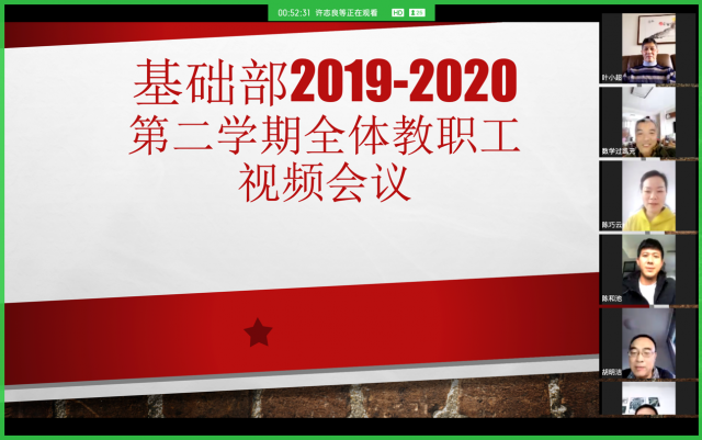 2020年2月11日下午3点半,基础部召开全体教职工视频会议,会议由基础部党总支书记、主任叶小超主持。