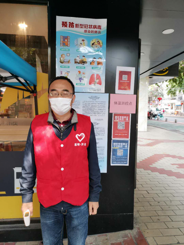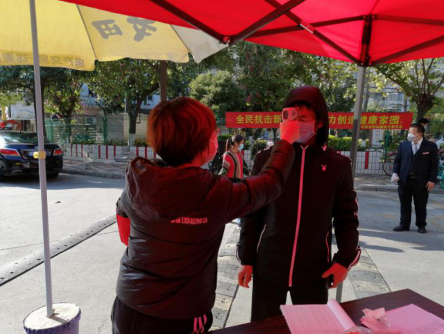 数学军事党支部胡明洁老师在疫情时刻勇当先锋,在美湖社区担任志愿者,在临时测温点对进出人员进行体温检测。