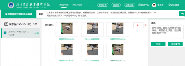 体育教研室鲁海涛老师一人管理9个班级,共439人,学生通过云课堂学习相关教学内容,进行居家锻炼,并拍照或录制视频完成作业,老师通过云课堂对每位同学的作业进行批改。对于上传的作业不符合规定的予以退回,并要求重新提交。同时在各个班学委的微信群,及时对各个班级的作业完成情况予以通报,督促学生进行居家锻炼。