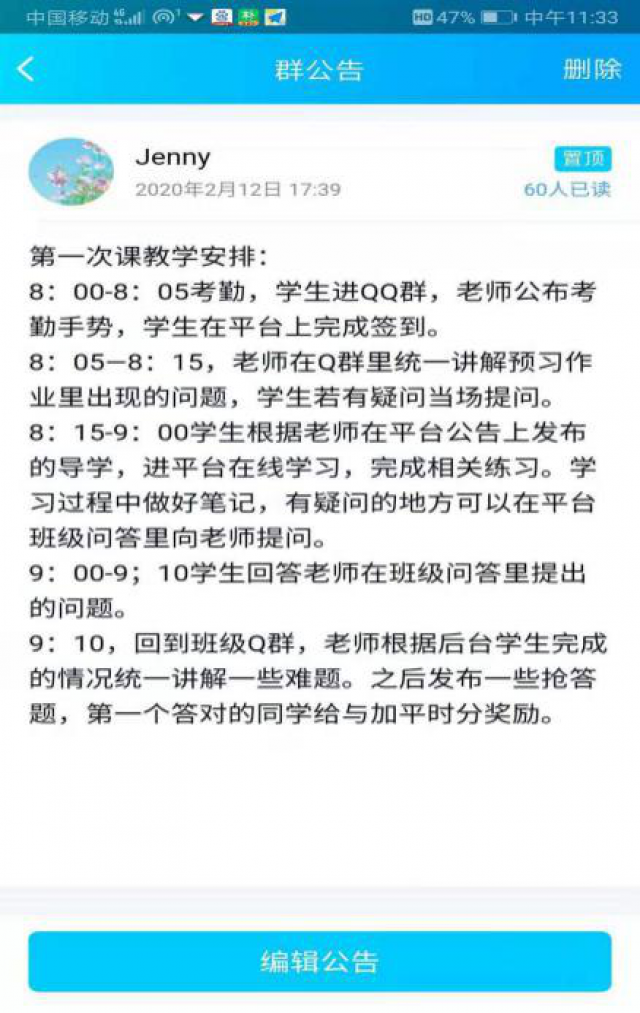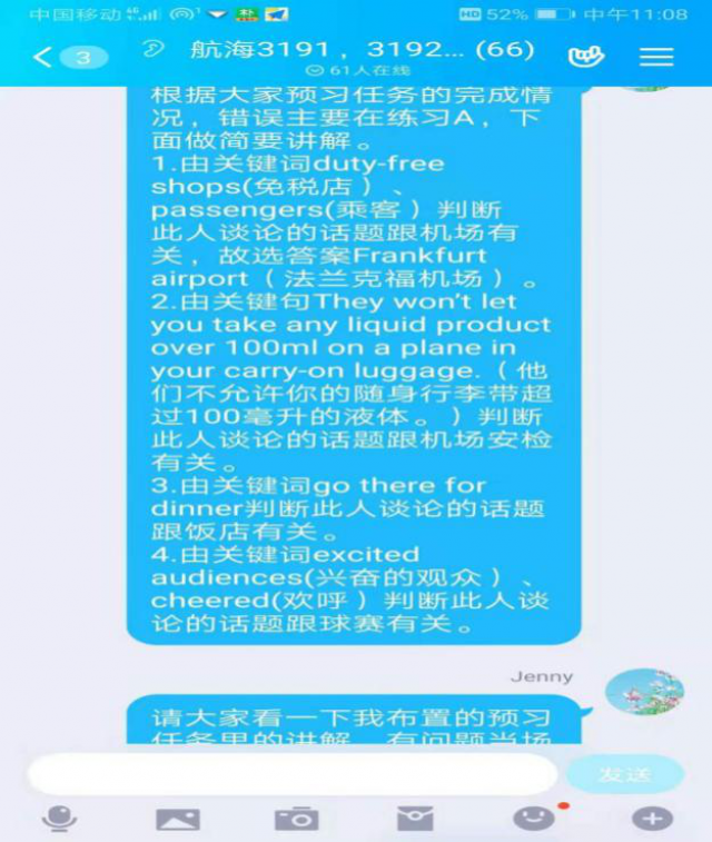 英语教研室黄培清老师采用Welearn随行课堂在线学习平台,结合QQ群与学生开展线上交流。Welearn在线平台具有实时签到,作业,问答,班级管理等功能。黄老师充分利用该平台掌握学生们的到课率,利用平台的班级任务发布预习,学习,复习等环节教学任务,并在平台的问答板块回答学生在各个环节的疑问。为了更好地和学生沟通,黄老师还充分利用同学们熟悉的QQ群,发布课堂教学安排表,在线提问抢答,在线反馈,答疑,第一时间了解同学们在学习中遇到的难点并给予针对性的帮助。