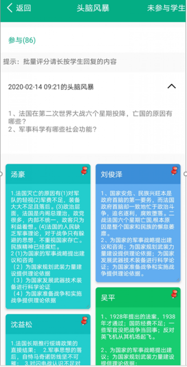 军事理论教研室胡明洁老师按照学校要求,建立了相关的qq群和微信群为上课与沟通做好了充分的准备。周三在云课堂平台瘫痪情况下,作好了相关的预案,将考勤、课件等材料上传到微信群,在群里和学生教学互动,通过互动和抢答了解学生学习的效果。周四按基础部要求进行了QQ教学功能的学习,主动掌握更多理好的教学手段,为今后网络教学打下基础。在周五的课程中通过云课堂和网络等多种形式对学生进行教学,课中进行相关内容的讨论,发布问卷调查、抢答讨论、头脑风暴等任务,教师也通过平台回答学生在学习过程中遇到的问题,课后将学生出勤、参与情况与学委进行交流,便于提高今后的教学工作。