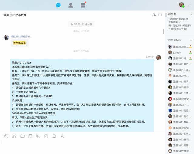 数学教研室蔡俊娟老师第一周采用“任务式”方式引导学生自学。在QQ群上布置几项相应的任务,学生通过查资料,云课堂知识的学习等完成自学的任务。在这个时代,自学能力对于提高学生的学习和工作还是有不少益处。因此,在疫情这种特殊时期,不仅是采用直播方式来替代正常的教学方式,更可以以培养学生独立思考问题的能力为主要培养目标。最后,老师以云课堂上的作业来检查学生自学的效果,并在第二周进行另一种方式的讲评与学习。