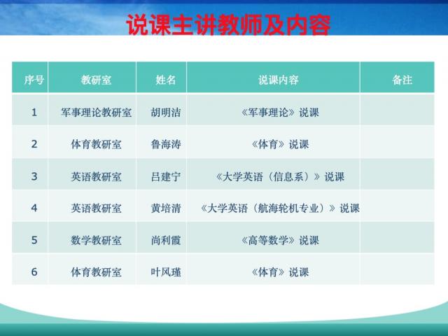 军事教研室的胡明洁老师,他讲授的课程《军事理论》结合案例,利用退伍学生进课堂等活动,让枯燥的军事理论课程活跃起来。体育教研室的鲁海涛《大学体育-健美操》,课程以健康第一为指导思想,突出学生主体地位,在教与学互动中用背景音乐体现健美操运动特点,培养学生对健美操的兴趣和终身锻炼的意识。吕建宁老师利用自己多年的教学经验,从学生的学情,深 入分析了学生在英语学习过程中存在的问题,向大家阐述了不同类型的学生应采取何种不同的指导策略。黄培清老师《大学英语(航海轮机专业)》的说课从三个方面向我们介绍了该门课程与高中课程、专业英语之间的关系与区别,做到英语语言与航海专业的特色结合。尚利霞老师带来的《高职应用数学》说课,注重学生能力与素质的培养,将抽象的概念、知识利用小组互助互帮,弱化概念,强调动手能力,注重学生的创新意识和创新精神的培养。体育教研室叶风瑾老师带来《大学体育-篮球》利用视频教学片段,现场分析教学重点与难点,从而达到教学目标,让大家赞叹不已。