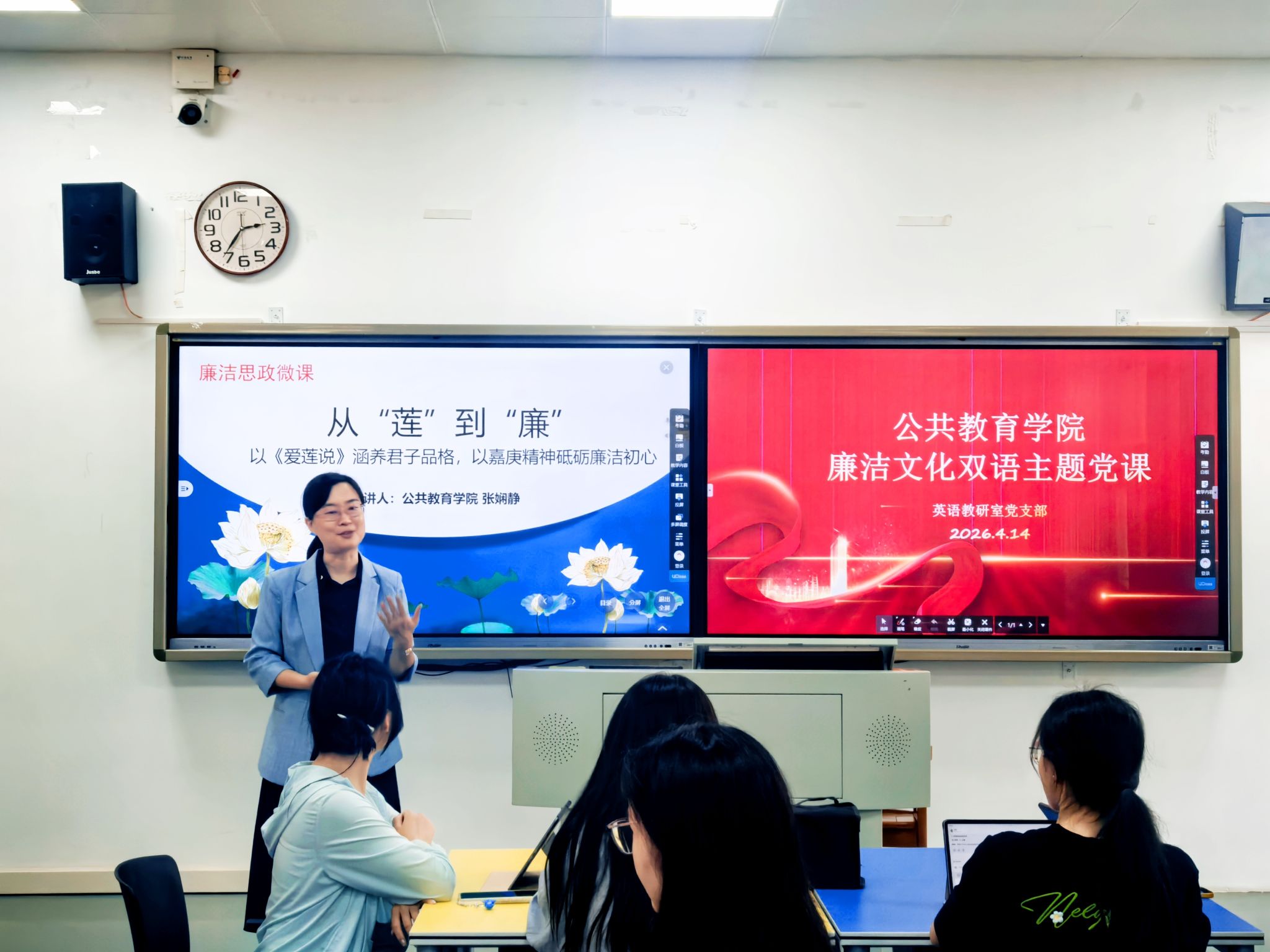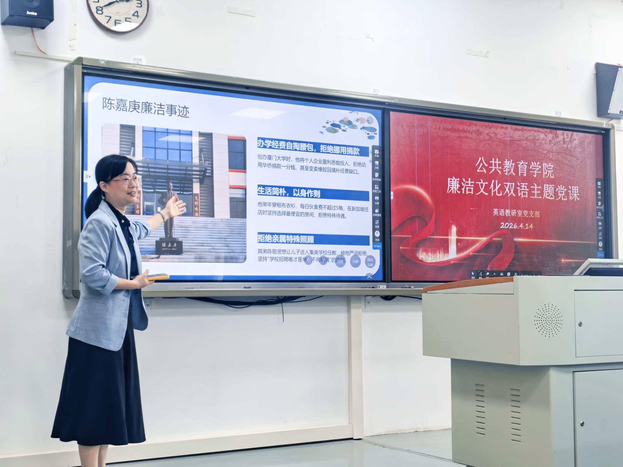 为深化廉洁文化教育,推动中华优秀传统文化与现代教育技术深度融合,4月14日,公共教育学院英语教研室党支部组织开展“嘉行惟廉 庚远惟俭”廉洁文化双语主题党课。英语教研室党员教师、校英语协会师生共同参与,以双语传播、AI赋能的创新形式,传承廉洁基因,弘扬嘉庚精神。