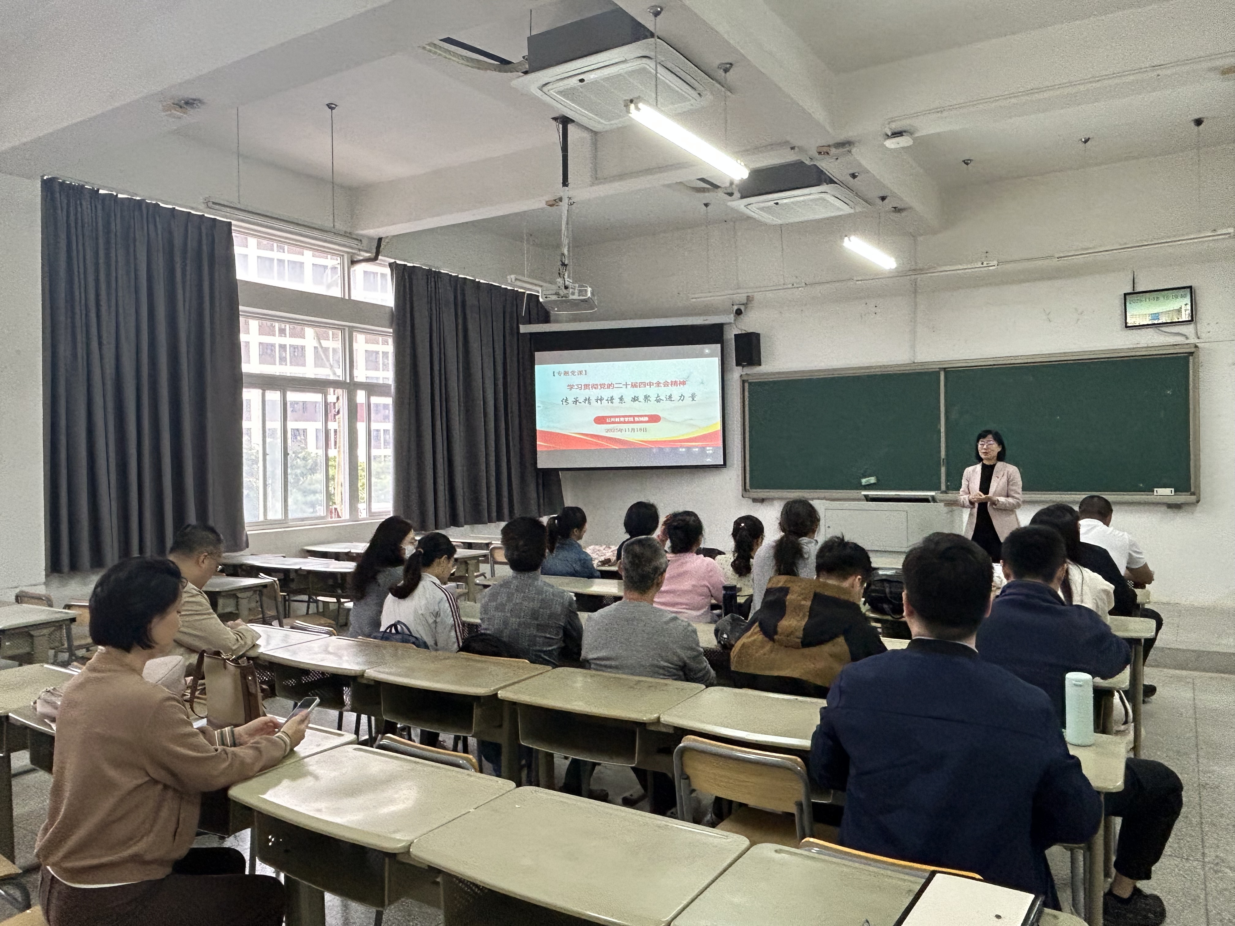 2025年11月18日,公共教育学院副院长张娴静以《传承精神谱系 凝聚奋进力量》为题,为全院教职工讲授专题党课,深入解读党的二十届四中全会精神。
