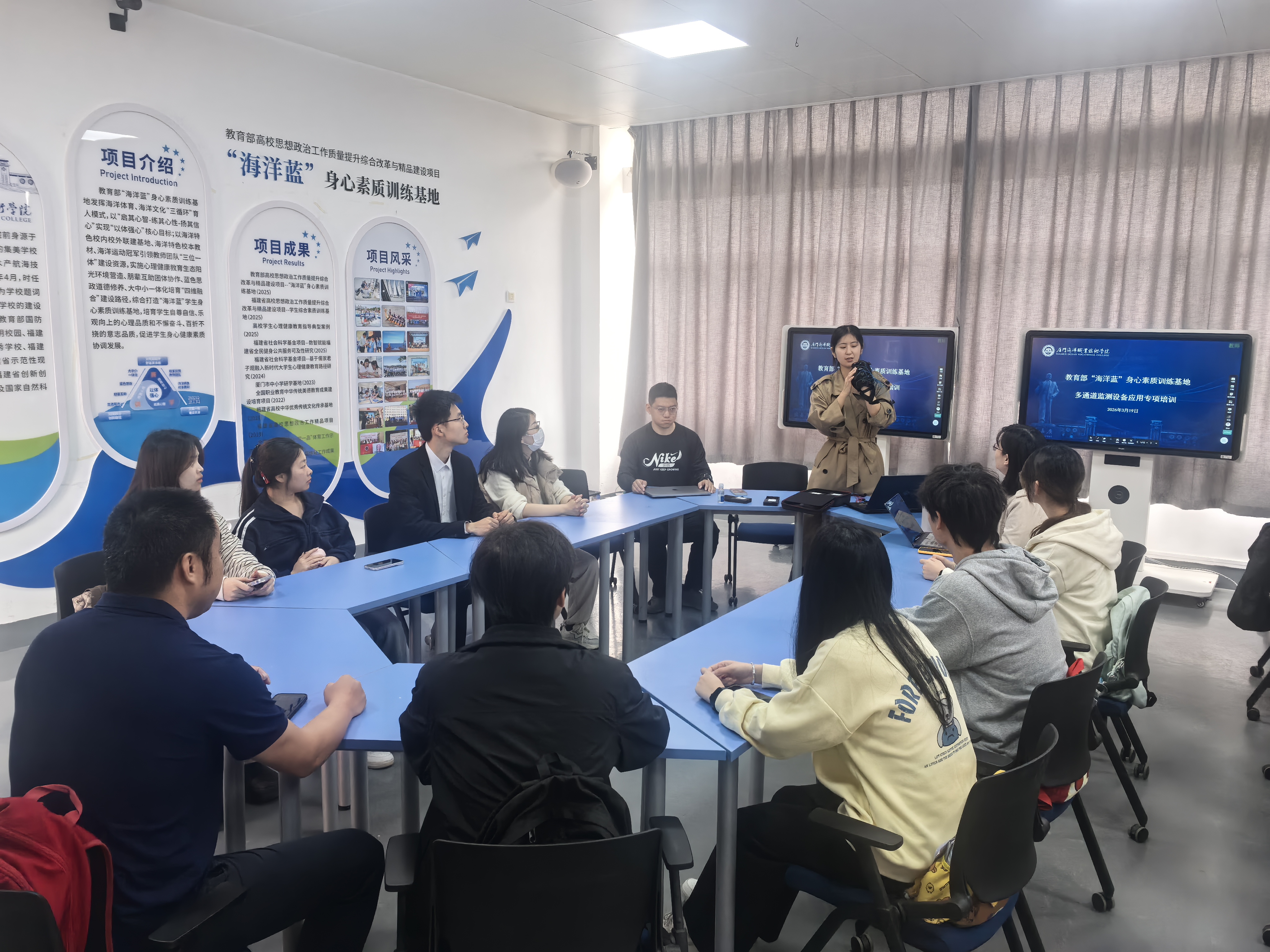 为充分发挥科技赋能学生身心素质训练成效,2026年3月19日,我校立项建设的教育部“海洋蓝”身心素质训练基地开展多通道监测设备应用专项培训。上海形宙信息技术有限公司技术人员担任主讲,“海洋蓝”基地建设团队成员全程参训。